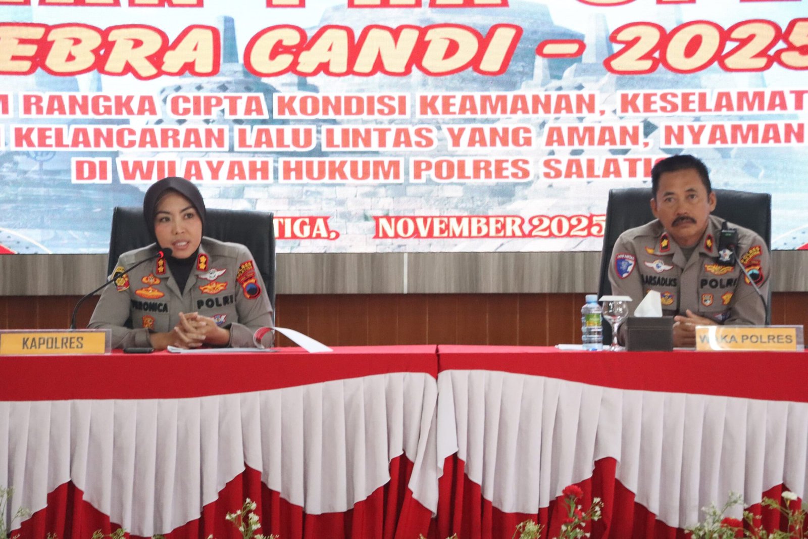 Kegiatan tersebut dipimpin langsung oleh Kapolres Salatiga AKBP Veronica, S.H., S.I.K., M.Si., didampingi Wakapolres Kompol R. Arsadi KS., S.E., M.H., dan diikuti oleh pejabat utama (PJU) serta seluruh personel yang terlibat dalam Operasi Zebra Candi 2025.
