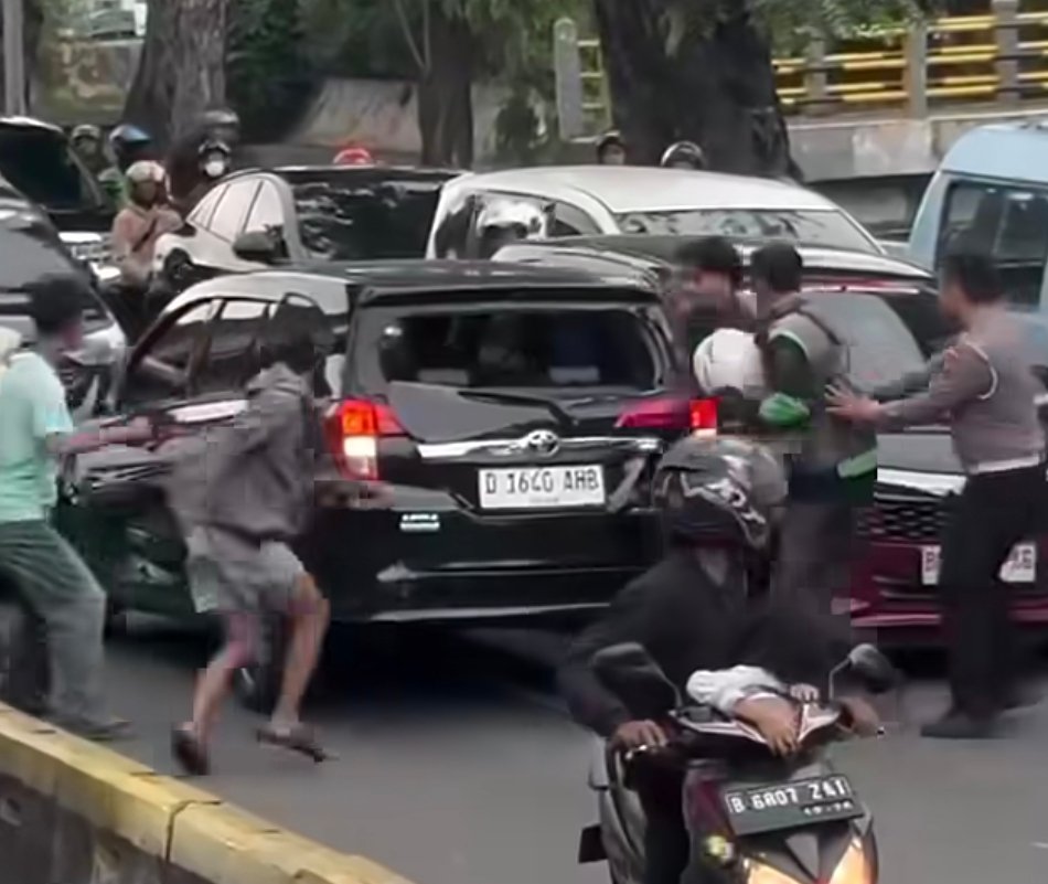 Setelah kendaraan akhirnya melambat, warga yang geram langsung mengejar minibus tersebut. Dalam rekaman video, terlihat beberapa orang memukulkan helm dan benda keras ke bodi mobil. Kaca kendaraan pecah, bagian depan rusak, dan suasana makin tak terkendali.