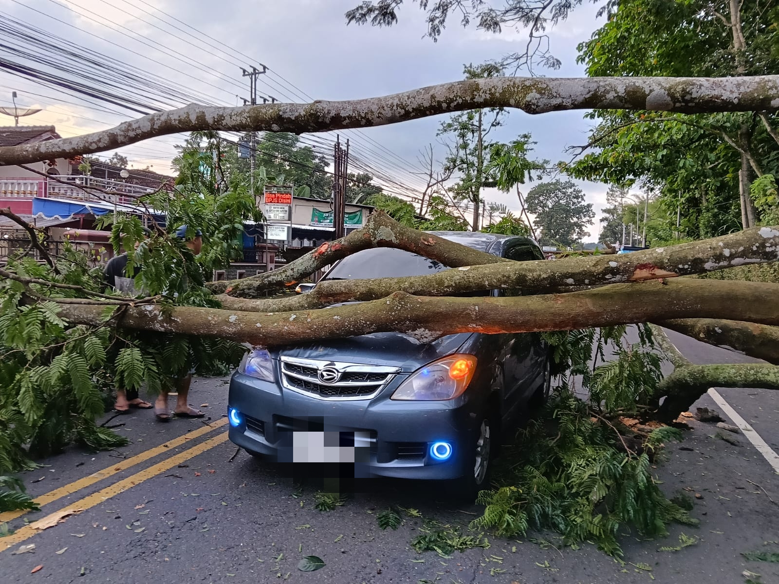 Angin Kencang Robohkan Pohon Pete 15 Meter, Timpa Sebuah Mobil dan Akibatkan Jalan Macet
