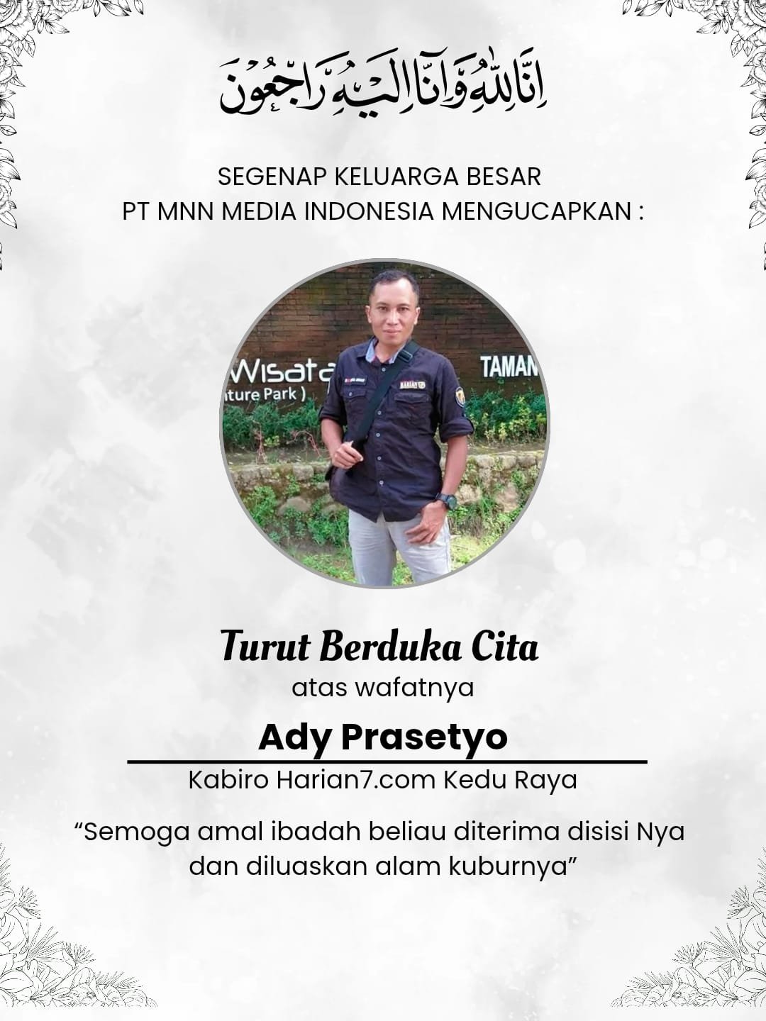 Direktur Utama PT MNN MEDIA INDONESIA, Muhamad Nuraeni, turut menyampaikan belasungkawa yang sangat mendalam.