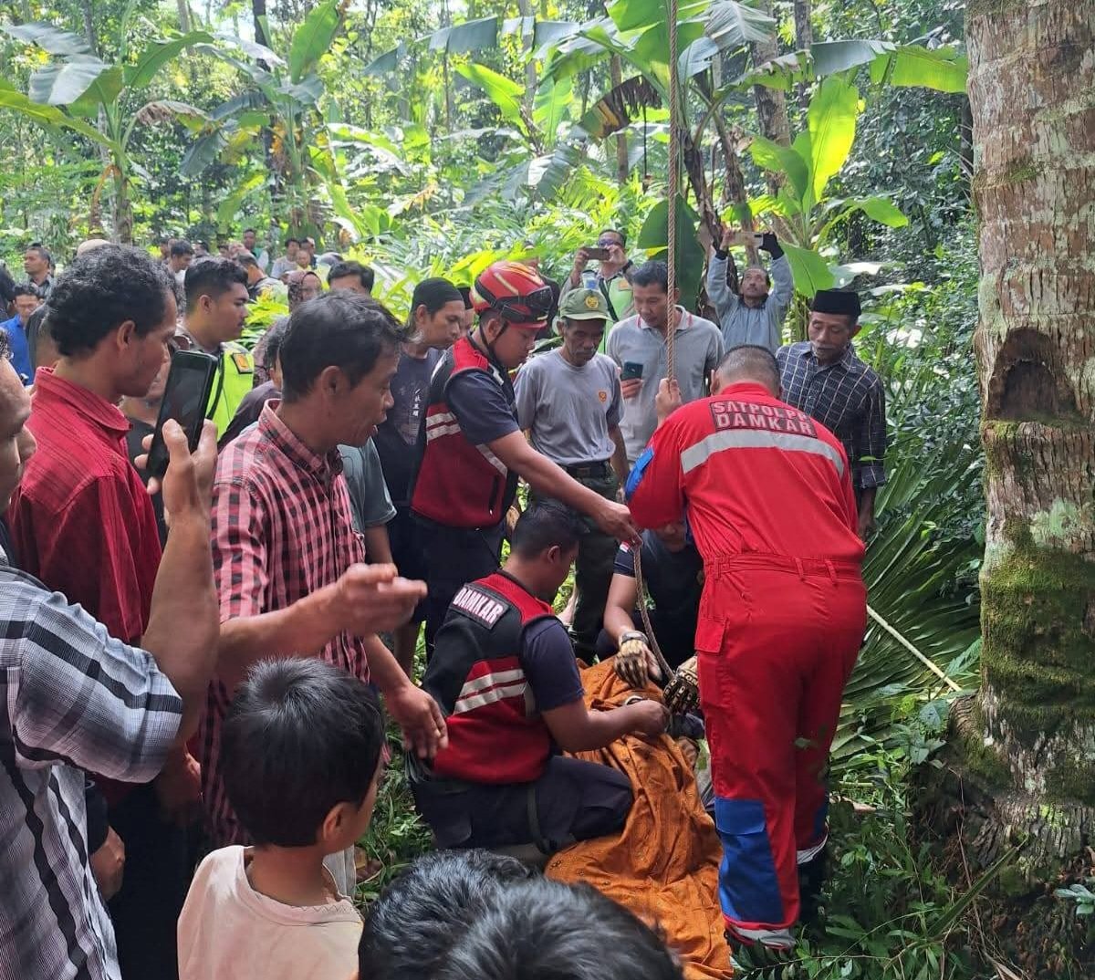Dengan penuh kehati-hatian, tubuh korban akhirnya berhasil diturunkan dari atas pohon.