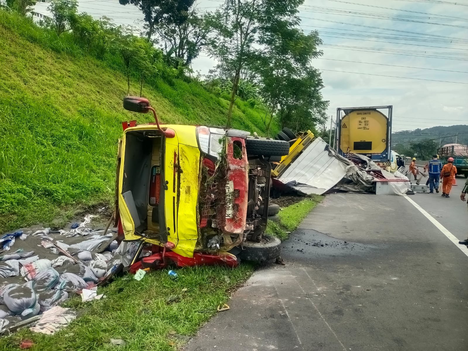 Pengemudi truk tangki, Pantom Tri Wahono (43), saat kejadian sedang beristirahat di aliran irigasi di tepi jalan tol. Ia turut menjadi korban setelah terkena serpihan material kendaraan akibat tabrakan tersebut.