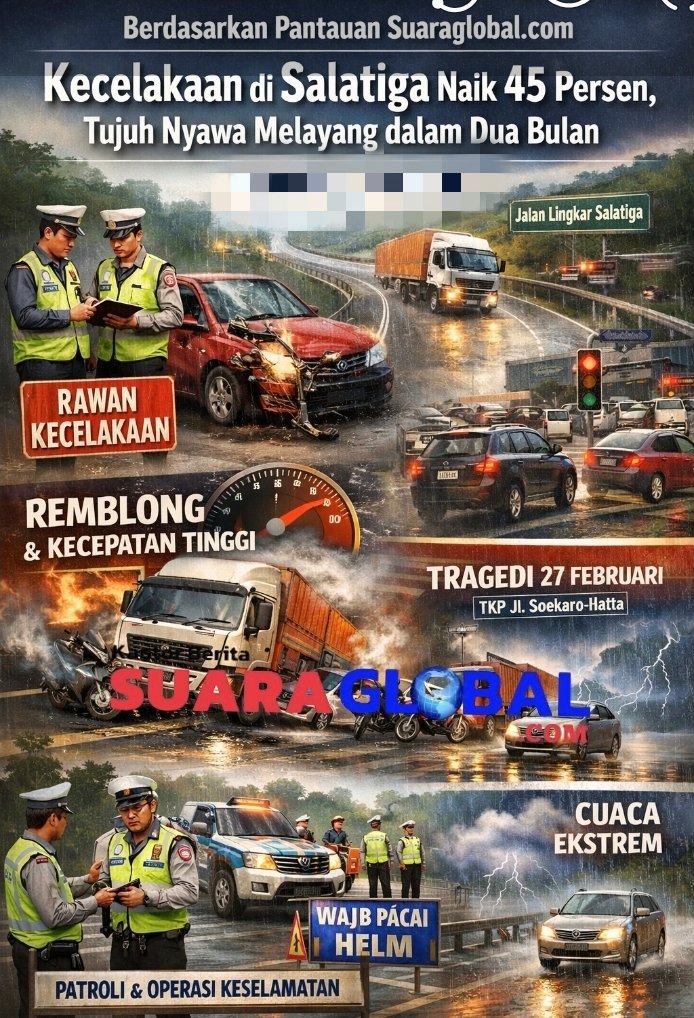 SALATIGA | SUARAGLOBAL.COM – Berdasarkan pantauan suaraglobal.com di lapangan dan data dihimpun, angka kecelakaan lalu lintas di Kota Salatiga sepanjang Januari hingga 2 Maret 2026 menunjukkan lonjakan signifikan. Tercatat 45 kasus kecelakaan dalam dua bulan pertama tahun ini, meningkat 45 persen dibanding periode yang sama tahun 2025 yang hanya mencapai 31 kasus.