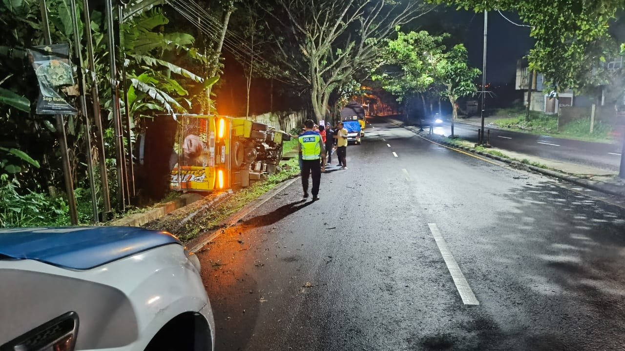 Meski tidak menimbulkan korban, peristiwa ini kembali menjadi pengingat pentingnya kehati-hatian di jalan, khususnya bagi pengemudi kendaraan besar.