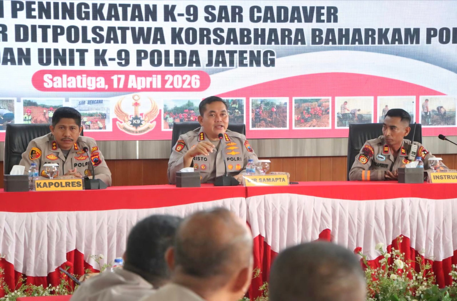 SALATIGA | SUARAGLOBAL.COM — Komitmen dalam memperkuat kesiapsiagaan dan profesionalisme aparat kepolisian kembali ditegaskan melalui gelaran Latihan Peningkatan Kemampuan (Latkatpuan) K-9 SAR Cadaver tingkat Polda Jawa Tengah yang resmi dilaksanakan di Pendopo Widya Qasana Tribrata Polres Salatiga, Kamis (17/04/2026).