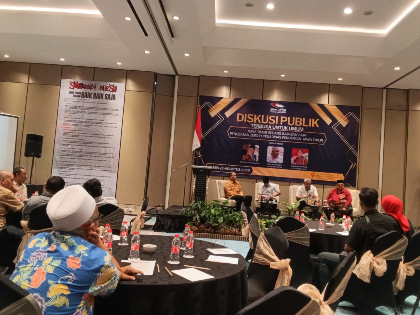 Diskusi publik tersebut menghadirkan empat narasumber berkelas, yakni Dr. Basa Alim Tualeka, Kunjung Wahyudi (Ketua FKKS Jawa Timur), Mat Mochtar (tokoh masyarakat Jawa Timur), serta Heru Satriyo selaku Ketua MAKI Jatim sekaligus moderator utama. Hadir pula Ketua KADIN Jawa Timur H. Adik Dwi Pratanto, S.H., M.HP., tokoh masyarakat Surabaya Sutadi, serta perwakilan BHS Sonny Wibisono.