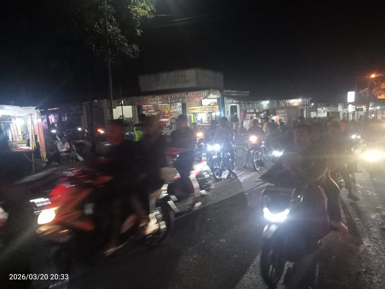 Namun, kemeriahan tersebut sempat menimbulkan kepadatan arus lalu lintas. Di titik krusial, yakni pertigaan Desa Sine, kemacetan tak terhindarkan akibat bertemunya rombongan takbir keliling dari berbagai arah. Arus kendaraan pun tersendat, bahkan sempat lumpuh beberapa saat.