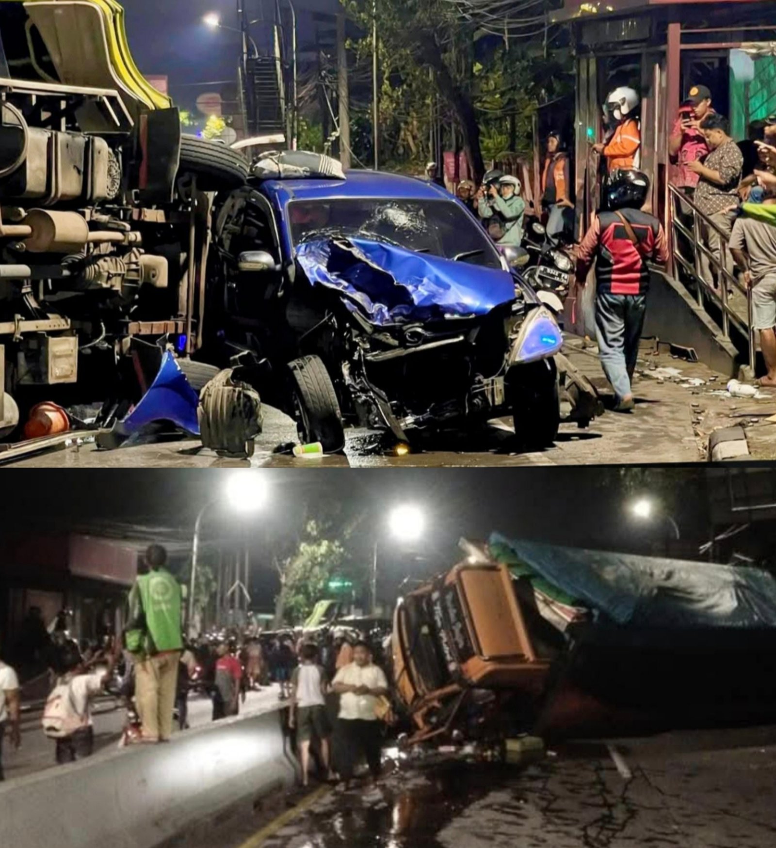 Truk yang melaju kencang itu berusaha menghindari deretan sepeda motor di sisi kiri jalan. Namun, manuver sopir justru membawa petaka. Truk menabrak truk bermuatan paket di depannya, kemudian melompat ke jalur berlawanan, menghantam mobil Avanza yang datang dari arah seberang.