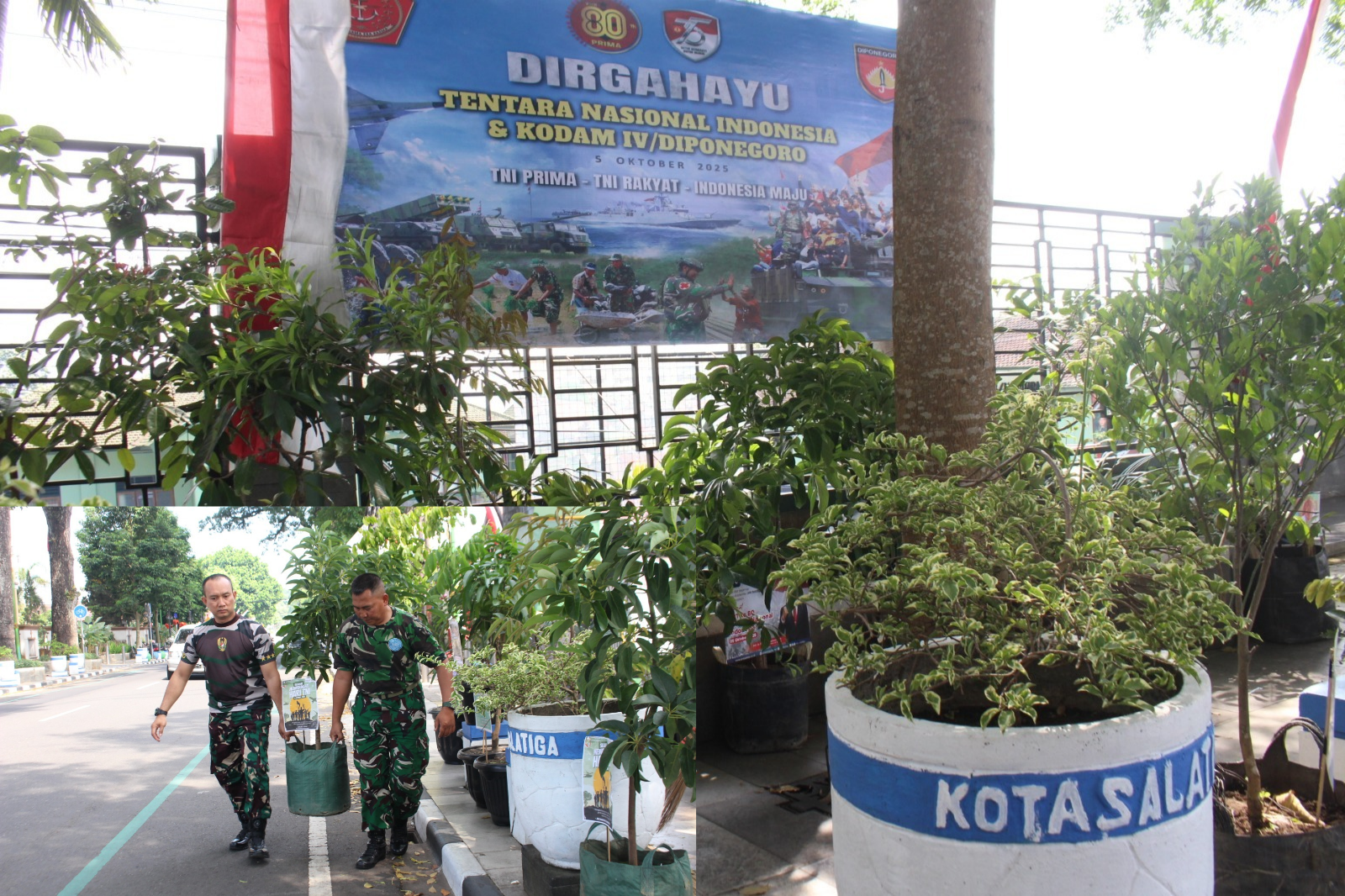 SALATIGA | SUARAGLOBAL.COM – Peringatan Hari Ulang Tahun (HUT) ke-80 Tentara Nasional Indonesia (TNI) di Markas Kodim 0714/Salatiga tahun ini menghadirkan wajah baru yang lebih hijau dan berkesan. Tak seperti tahun-tahun sebelumnya yang penuh dengan deretan karangan bunga ucapan selamat, kali ini halaman markas tampak bersih dari hiasan bunga yang biasanya hanya bertahan beberapa hari.