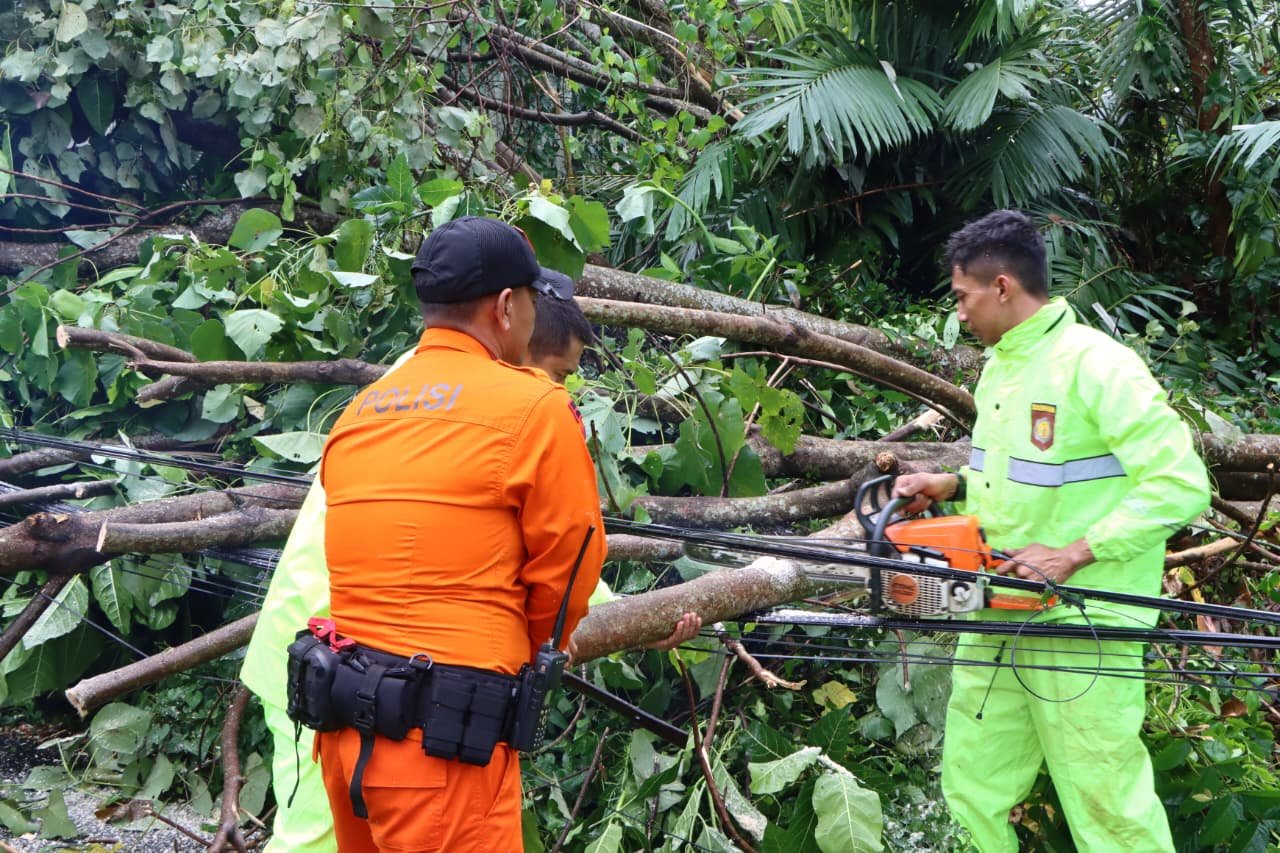 “Begitu mendapat laporan, kami segera turunkan tim dari Polres dan Polsek jajaran untuk mengevakuasi pohon tumbang serta membantu warga terdampak. Kami pastikan seluruh akses jalan kembali aman dan bisa dilalui,” jelas AKBP Veronica di sela proses penanganan.