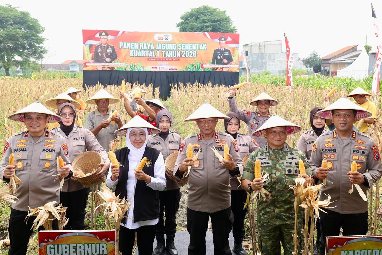 SIDOARJO | SUARAGLOBAL.COM — Kepolisian Daerah Jawa Timur kembali menunjukkan komitmennya terhadap ketahanan pangan melalui penyelenggaraan Panen Raya Jagung Serentak Kuartal IV Tahun 2025–2026 yang digelar di Desa Kedensari, Kecamatan Tanggulangin, Kabupaten Sidoarjo, Kamis (8/1/2026).