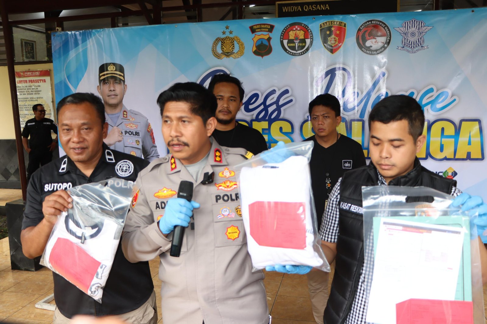 Press release dipimpin langsung Kapolres Salatiga AKBP Ade Papa Rihi, S.H., S.I.K., M.H., didampingi Kasat Reskrim AKP Radytya Triatmaji Pramana, S.H., M.H., serta Plh. Kasi Humas Ipda Sutopo.