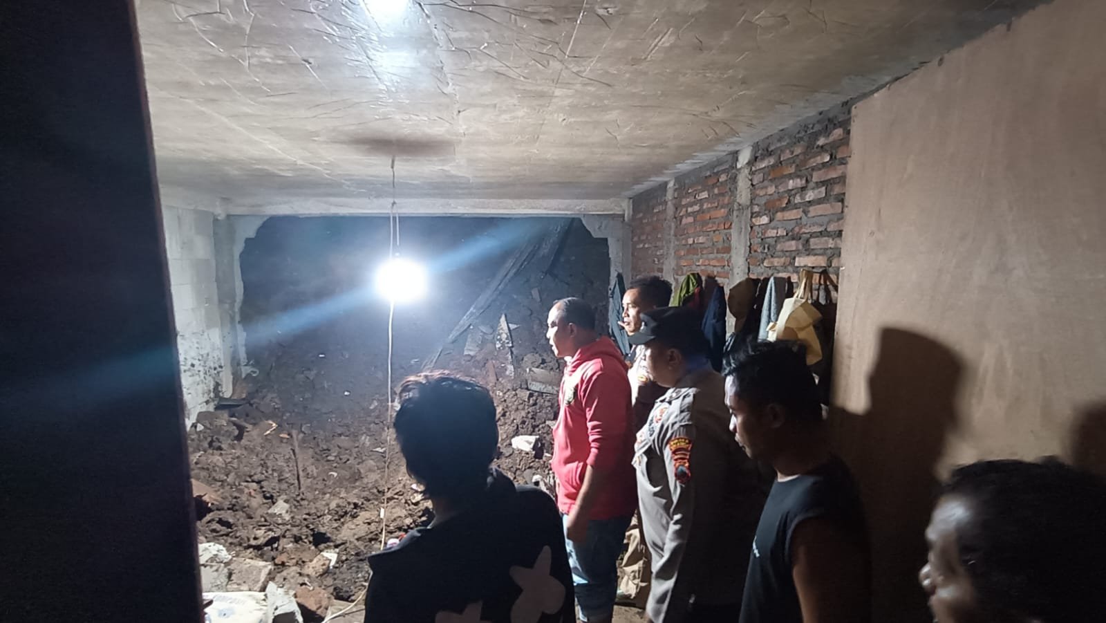 Sekitar pukul 02.30 WIB, salah satu saksi terbangun karena mendengar suara gemuruh seperti tanah runtuh. Dalam hitungan detik, tembok ruangan tempat mereka beristirahat tiba-tiba longsor dan roboh.